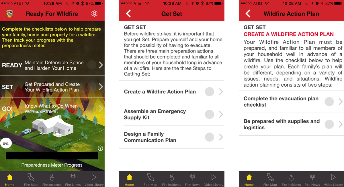 Once you are in the App, you can choose from a variety of options based on the CalFire Ready, Set, Go! model. The example sequence below shows what happens if you click Set. You get a list of options to start preparing. If you click on Create a Wildfire Action Plan, the next screen shows you options for checklists. You can then mark the checklist for what you’ve accomplished so far.
