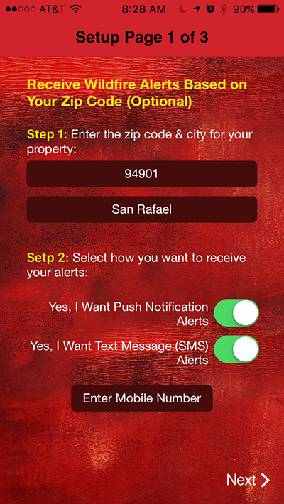 After you download the free app, the setup is a quick 3 steps! Agree to receive SMS text messages for current updates. You can always do this later if a fire is close or if you are traveling near a fire incident.
