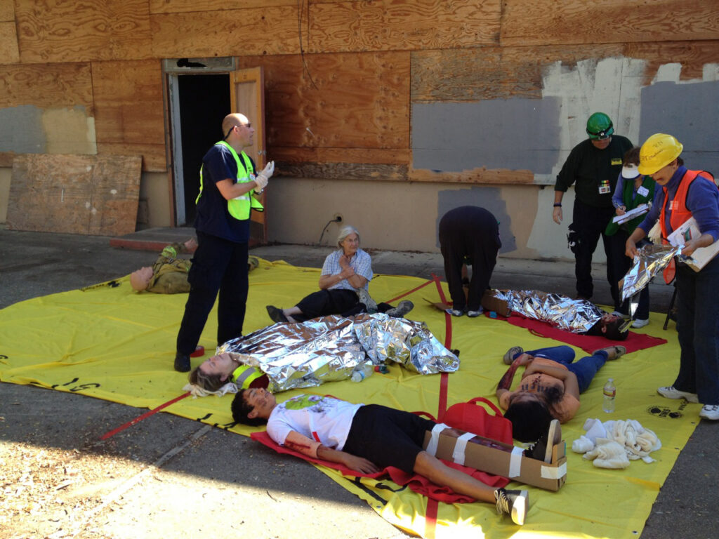 Also, we always need volunteers to act as victims in our CERT trainings. The photo is a San Rafael High School student pretending to be injured (fake blood) and being carried by CERTs to a medical area. Contact us if you’re interested.
