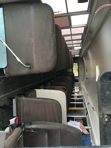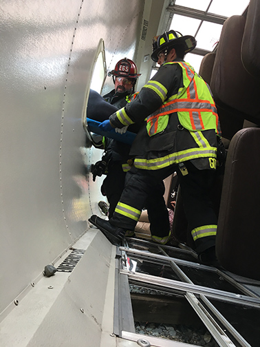The simulation begins! We start moaning, yelling out and some screaming. While it was all fake, it is still an unnerving experience. The firefighters walked one victim out of the bus but the rest were put on backboards and sent out the skylight. It took about 20 minutes to evacuate the whole bus.