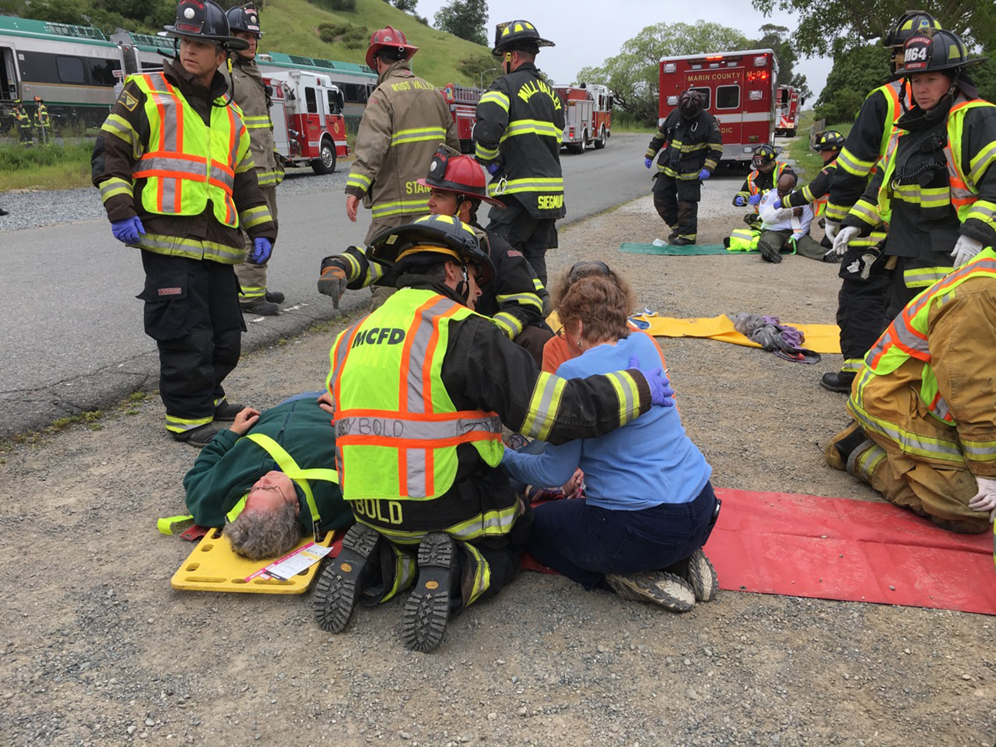 On April 26, multiple agencies in Marin County participated in a simulated SMART train multiple patient management drill. The incident simulated a train hitting a bus and took place at McGinnis Park in San Rafael. A dozen agencies were involved, including fire departments, hospitals, and more.