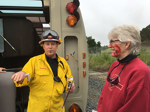 Battalion Chief Michael St. John, from the Mill Valley Fire Department, put out a call to CERT graduates to volunteer as victims in the drill. This was a great opportunity to participate in a simulation with the professional first responders. There were two simulations, one in the morning and one in the afternoon. 10-12 CERTs were placed in the bus, which was on its side. The SMART train had 25 victims, all of whom were volunteer SMART employees. The challenge for the first responders were to manage the large amount of patients, and learn how to access the train and turn it off.
