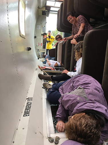 A bus on its side is disorienting! The mannequin on the floor is part of the simulation. One of the CERTs will be performing CPR on it when the first responders arrive.